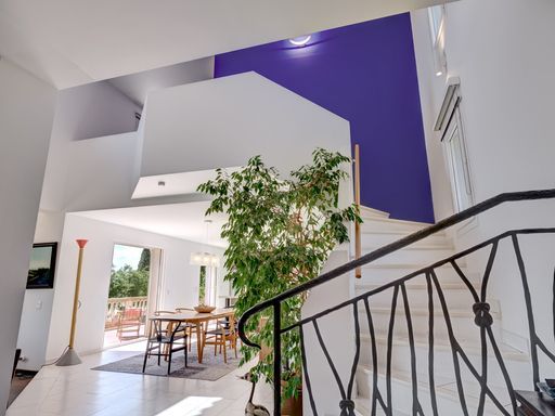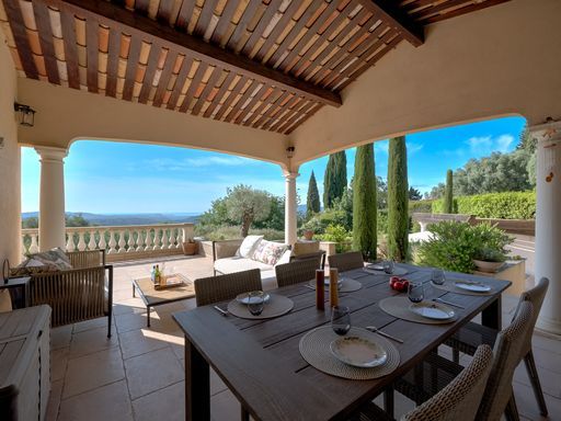 Architektenvilla im Hinterland von Cannes, im Coëlle Stil mit wunderbarem Panoramablick bis zum Meer. 5 Schlafzimmer, Einliegerwohnung, Kamin, Pool, Sommerküche, Garage, Carport